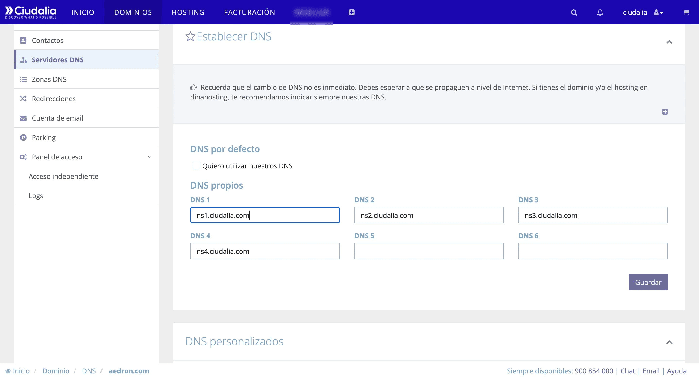 Establecer los servidores DNS de Ciudalia en tu dominio