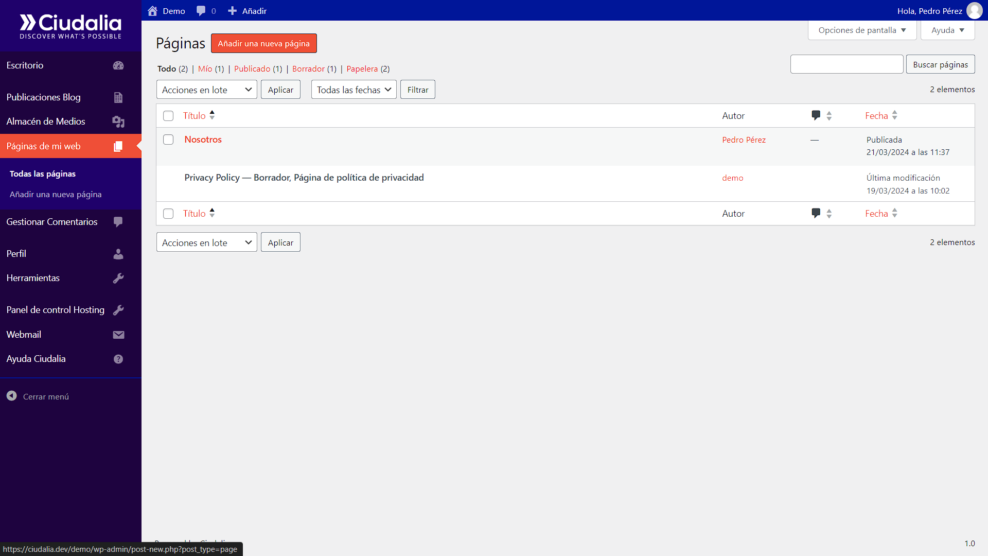Desde el inicio, haz click en la sección de "Páginas de mi web"