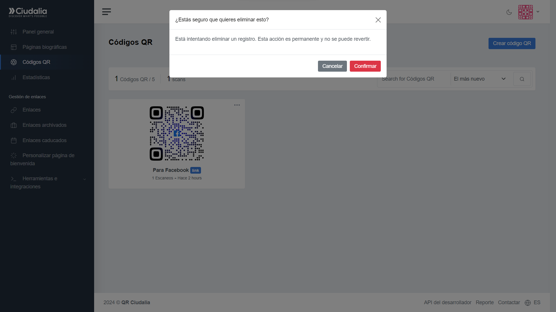 Haz click en el botón de "Confirmar" para eliminar definitivamente el Código QR