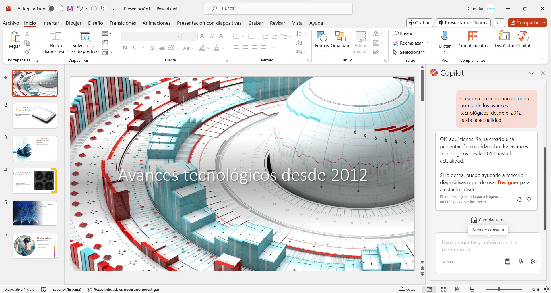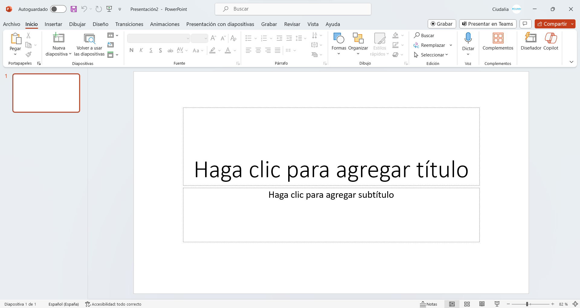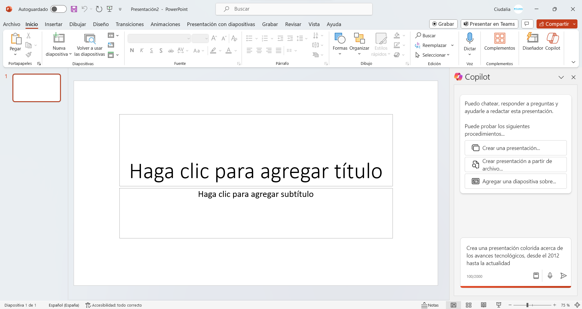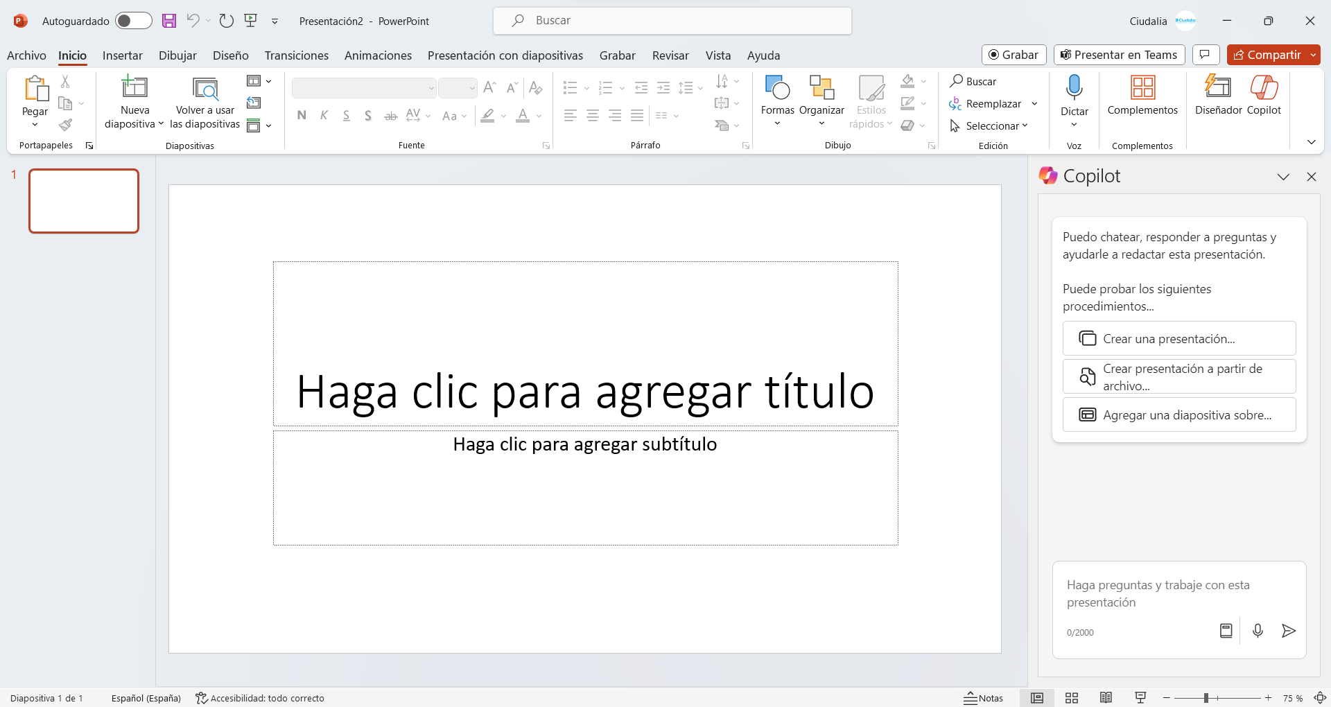 Dentro de Microsoft PowerPoint, haz click en el icono de Copilot
